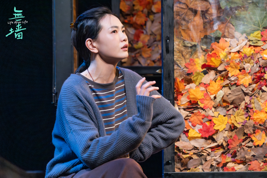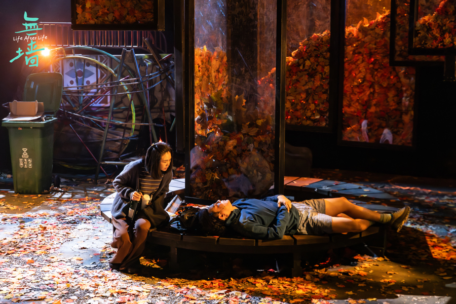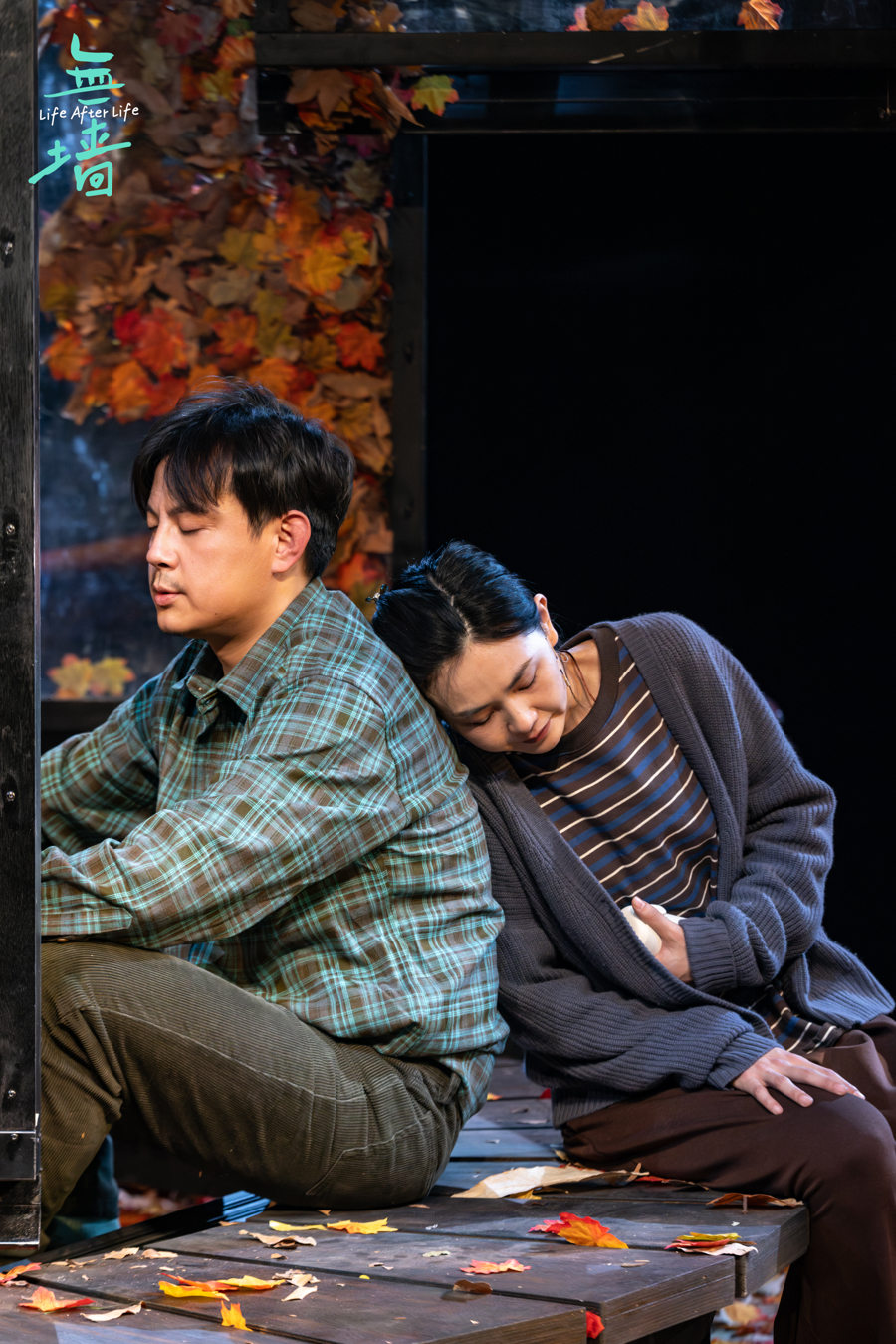 随着剧情的推进,这成为了全剧最动人的视觉隐喻——当台上的男人与女人逐渐试探、敞开心扉,箱中的落叶便会阶段性地簌簌落下。这落叶不仅是深秋的萧瑟,更承载着双重含义:它既是剧中人积压在心底、无法对亲近之人言说的隐私与重负,随着沟通倾泻而出;也象征着两个陌生人之间原本坚硬的隔阂,随着落叶的坠地而逐渐消融,直至真正变得“无墙”。