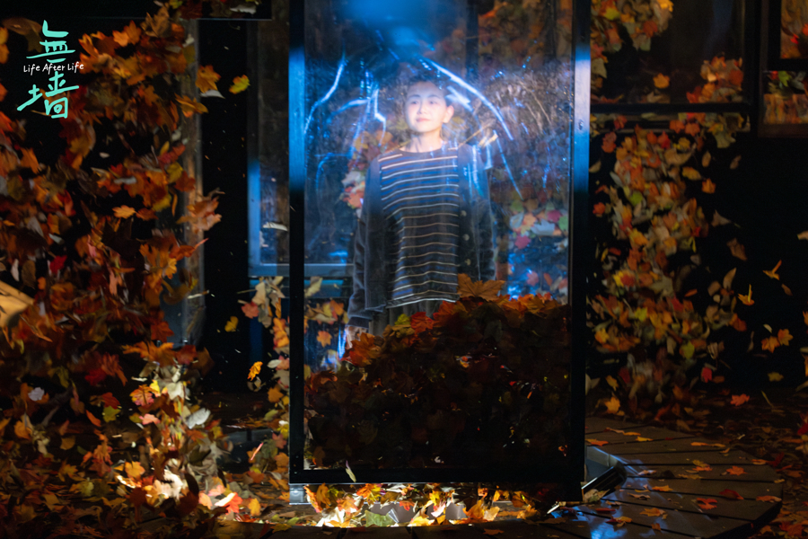 当演出临近尾声,天光渐亮,玻璃箱已然空空荡荡,地上的落叶铺陈出一片金黄。男人和女人因为一通电话戛然而止地结束对话,回归各自的生活轨道,这次偶遇或许不会改写他们生活的巨浪,但至少在这一夜,他们完成了一次灵魂的“排毒”。