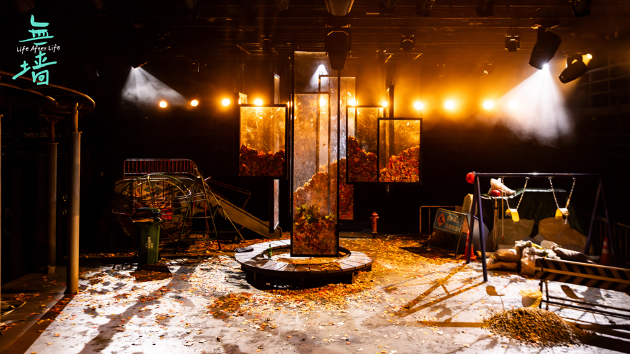 走进剧场,观众首先会被独特的舞美装置吸引:舞台被构建成一个正在整修中的街角公园,有废弃的大象滑梯、未完成的新秋千。而在舞台上方,悬挂着许多透明的玻璃箱,里面塞满了枯黄的落叶。