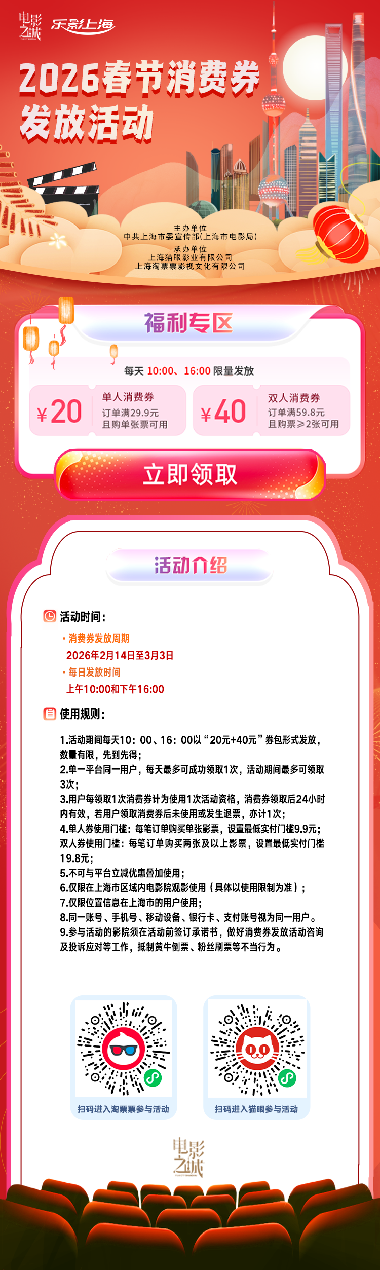 本次消耗券披发,保留了“乐影上海”一贯即领即用、使用毛糙的特色,并进一步加多披发频次:2026年2月14日至3月3日历间,市民可于每天10:00、16:00,登录猫眼、淘票票两大票务平台领取“乐影上海”春节消耗券,每个用户在单一平台至多可领取3次消耗券。消耗券将以“20元+40元”券包面目披发,单次领取可餍足全家多东说念主分次或同步购票优惠,适配家庭不雅影、亲一又同业等多元场景。每位上海市民最多可享6次,忖度360元减免优惠。
