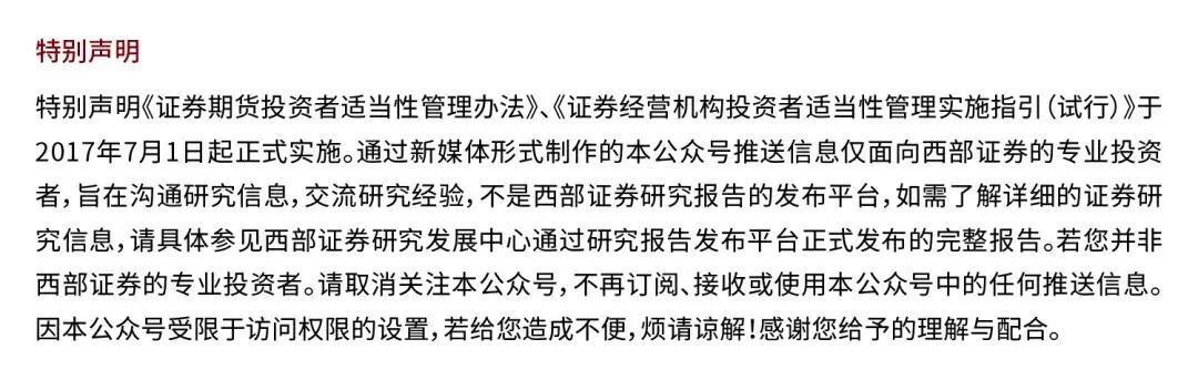 ]article_adlist-->免责声明:本报告由西部证券股份有限公司(已具备中国证监会批复的证券投资咨询业务资格)制作。本报告仅供西部证券股份有限公司(以下简称“本公司”)机构客户使用。本报告在未经本公司公开披露或者同意披露前,系本公司机密材料,如非收件人(或收到的电子邮件含错误信息),请立即通知发件人,及时删除该邮件及所附报告并予以保密。发送本报告的电子邮件可能含有保密信息、版权专有信息或私人信息,未经授权者请勿针对邮件内容进行任何更改或以任何方式传播、复制、转发或以其他任何形式使用,发件人保留与该邮件相关的一切权利。同时本公司无法保证互联网传送本报告的及时、安全、无遗漏、无错误或无病毒,敬请谅解。本报告基于已公开的信息编制,但本公司对该等信息的真实性、准确性及完整性不作任何保证。本报告所载的意见、评估及预测仅为本报告出具日的观点和判断,该等意见、评估及预测在出具日外无需通知即可随时更改。在不同时期,本公司可能会发出与本报告所载意见、评估及预测不一致的研究报告。同时,本报告所指的证券或投资标的的价格、价值及投资收入可能会波动。本公司不保证本报告所含信息保持在最新状态。对于本公司其他专业人士(包括但不限于销售人员、交易人员)根据不同假设、研究方法、即时动态信息及市场表现,发表的与本报告不一致的分析评论或交易观点,本公司没有义务向本报告所有接收者进行更新。本公司对本报告所含信息可在不发出通知的情形下做出修改,投资者应当自行关注相应的更新或修改。本公司力求报告内容客观、公正,但本报告所载的观点、结论和建议仅供投资者参考之用,并非作为购买或出售证券或其他投资标的的邀请或保证。客户不应以本报告取代其独立判断或根据本报告做出决策。该等观点、建议并未考虑到获取本报告人员的具体投资目的、财务状况以及特定需求,在任何时候均不构成对客户私人投资建议。投资者应当充分考虑自身特定状况,并完整理解和使用本报告内容,不应视本报告为做出投资决策的唯一因素,必要时应就法律、商业、财务、税收等方面咨询专业财务顾问的意见。本公司以往相关研究报告预测与分析的准确,不预示与担保本报告及本公司今后相关研究报告的表现。对依据或者使用本报告及本公司其他相关研究报告所造成的一切后果,本公司及作者不承担任何法律责任。在法律许可的情况下,本公司可能与本报告中提及公司正在建立或争取建立业务关系或服务关系。因此,投资者应当考虑到本公司及/或其相关人员可能存在影响本报告观点客观性的潜在利益冲突。对于本报告可能附带的其它网站地址或超级链接驰牛配资,本公司不对其内容负责,链接内容不构成本报告的任何部分,仅为方便客户查阅所用,浏览这些网站可能产生的费用和风险由使用者自行承担。本公司关于本报告的提示(包括但不限于本公司工作人员通过电话、短信、邮件、微信、微博、博客、QQ、视频网站、百度官方贴吧、论坛、BBS)仅为研究观点的简要沟通,投资者对本报告的参考使用须以本报告的完整版本为准。本报告版权仅为本公司所有。未经本公司书面许可,任何机构或个人不得以翻版、复制、发表、引用或再次分发他人等任何形式侵犯本公司版权。如征得本公司同意进行引用、刊发的,需在允许的范围内使用,并注明出处为“西部证券研究发展中心”,且不得对本报告进行任何有悖原意的引用、删节和修改。如未经西部证券授权,私自转载或者转发本报告,所引起的一切后果及法律责任由私自转载或转发者承担。本公司保留追究相关责任的权力。所有本报告中使用的商标、服务标记及标记均为本公司的商标、服务标记及标记。本公司具有中国证监会核准的“证券投资咨询”业务资格,经营许可证编号为:91610000719782242D。