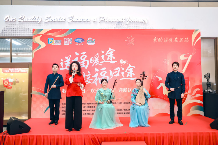 当天,虹桥火车站内外旅客来来往往、川流不息,出发层的心尚服务工作室前更是热闹异常。上午9:30,一场主题为“‘送福暖途·接福归途’暨‘我们的节日·欢乐中国年’迎新送福活动”在此开场,一边是众多书法家在挥毫写春联,红纸翻飞、墨香四溢,另一边是上海民族乐团在台上倾情表演,为南来北往的旅客铺就一条充满城市温度与传统文化气息的归家路。