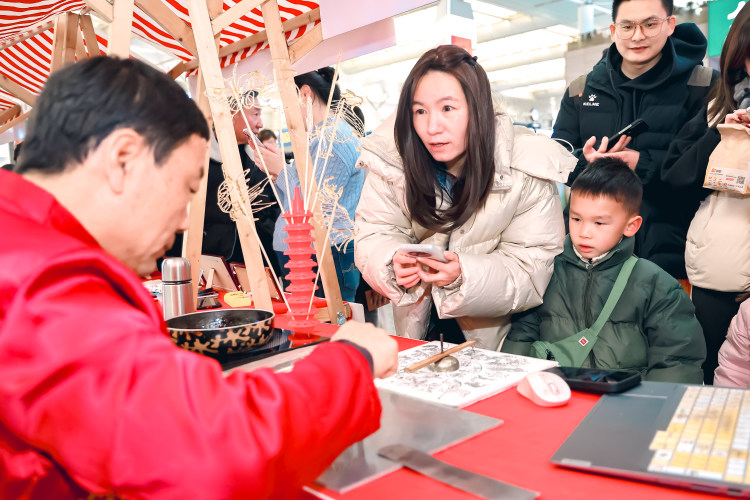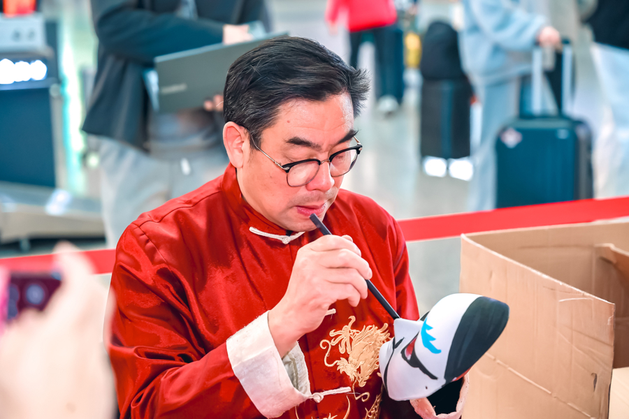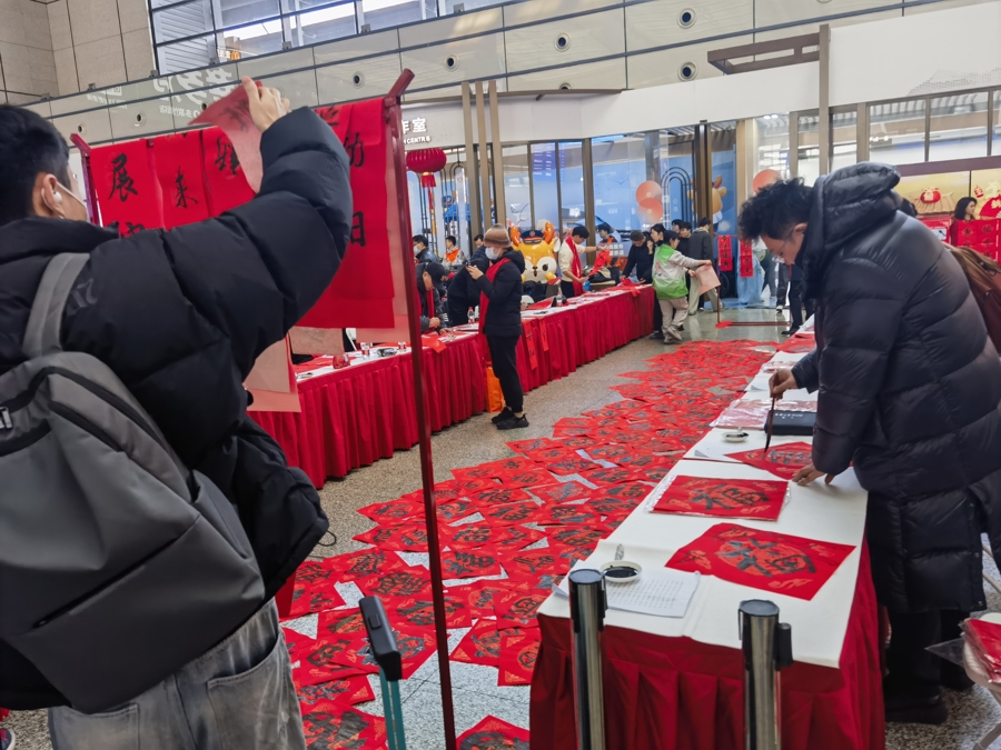 在出发层的“翰墨迎春”区域,书法家们挥毫泼墨,将一幅幅寓意吉祥的春联和“福”字赠予旅客。“没想到赶火车还能收到手写春联,股市大盘行情年味一下子浓了!”正准备回湖南老家的李女士手捧一张大大的“福”字笑道。