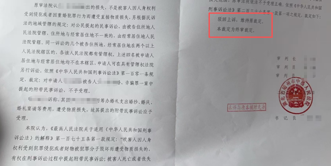 备受关怀的湖北小伙碰到婚骗一案迎来新发达。2月14日,该案刑事附带民事诉讼原告声名(假名)从随州市中级东谈主民法院拿到裁定书,因统率权等原因,法院对声名在被告东谈主尹霞(假名)再嫁、糊弄罪一案中拿起的附带民事诉讼,不予受理。