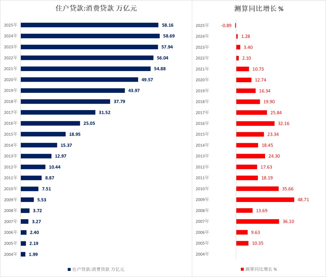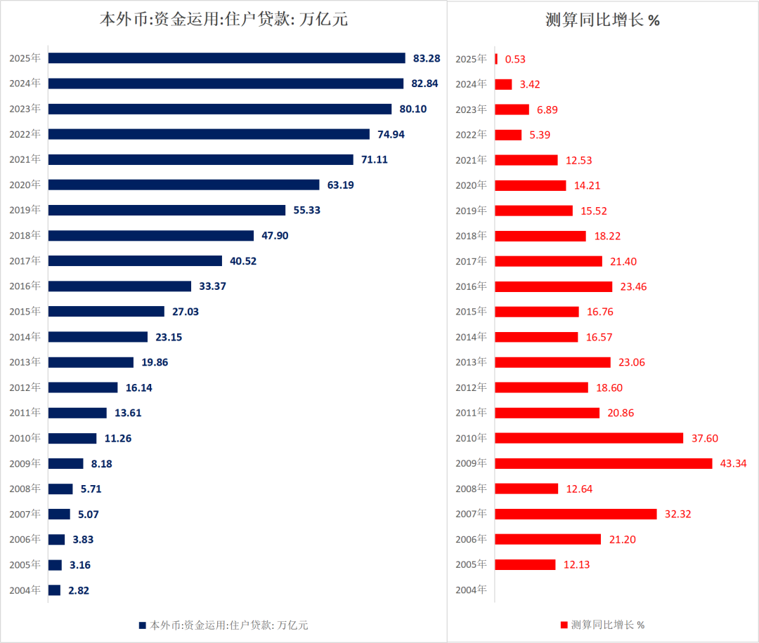 截止到2025年底,居民贷款总额是83.28万亿,测算同比是增长0.53%,增速历史最低,增量是0.44万亿。