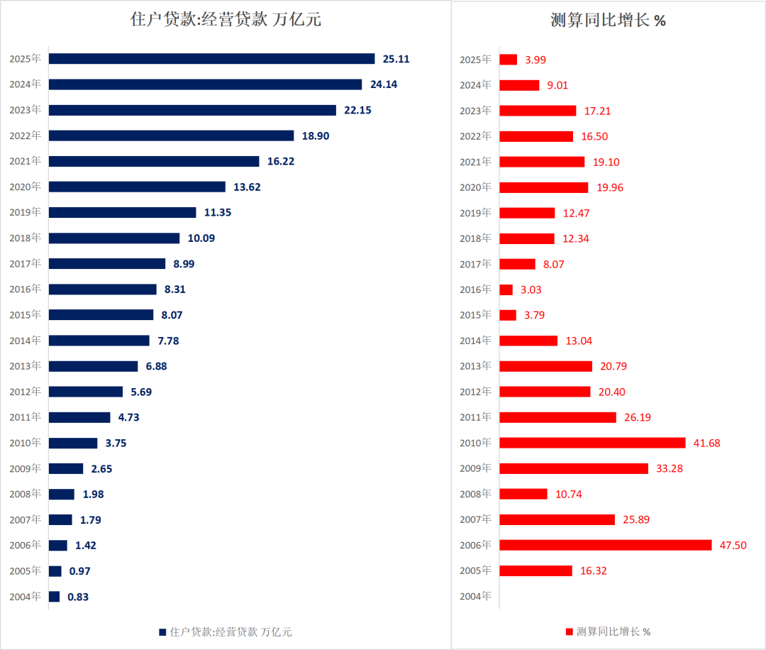 贷款余额从 2004 年的1.60 万亿元一路攀升至 2022 年的38.80 万亿元,18 年间增长超 23 倍,是居民部门加杠杆、房地产市场快速发展的核心体现。