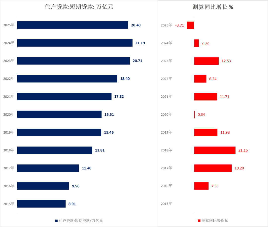 其中短期贷款余额20.4万亿,测算同比下降3.71%,有数据以来首次下降。