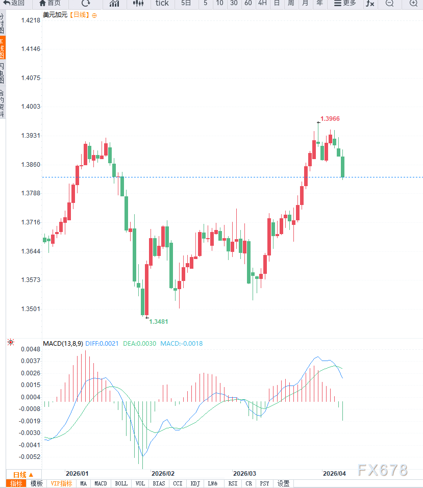 好意思元兑加元在周三亚洲时段延续回落走势,汇价跌至1.3835隔邻,主要受到好意思元走弱的推进。此前中东阵势出现放松迹象,好意思国秘书暂停对伊朗军事步履两周,市集避险情感明显降温,好意思元算作避险金钱的需求随之下降。有外汇市集分析东说念主士暗意:“跟着地缘风险缓解,好意思元避险溢价回吐,短期走势转向偏弱。”