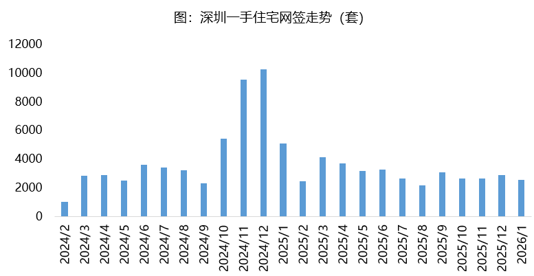 2026年1月深圳一手住宅网签2579套,环比降低10.7%、同比降低49.3%,主要是因为新盘入市节奏放缓,加上部分区域库存结构调整,短期成交出现回落。