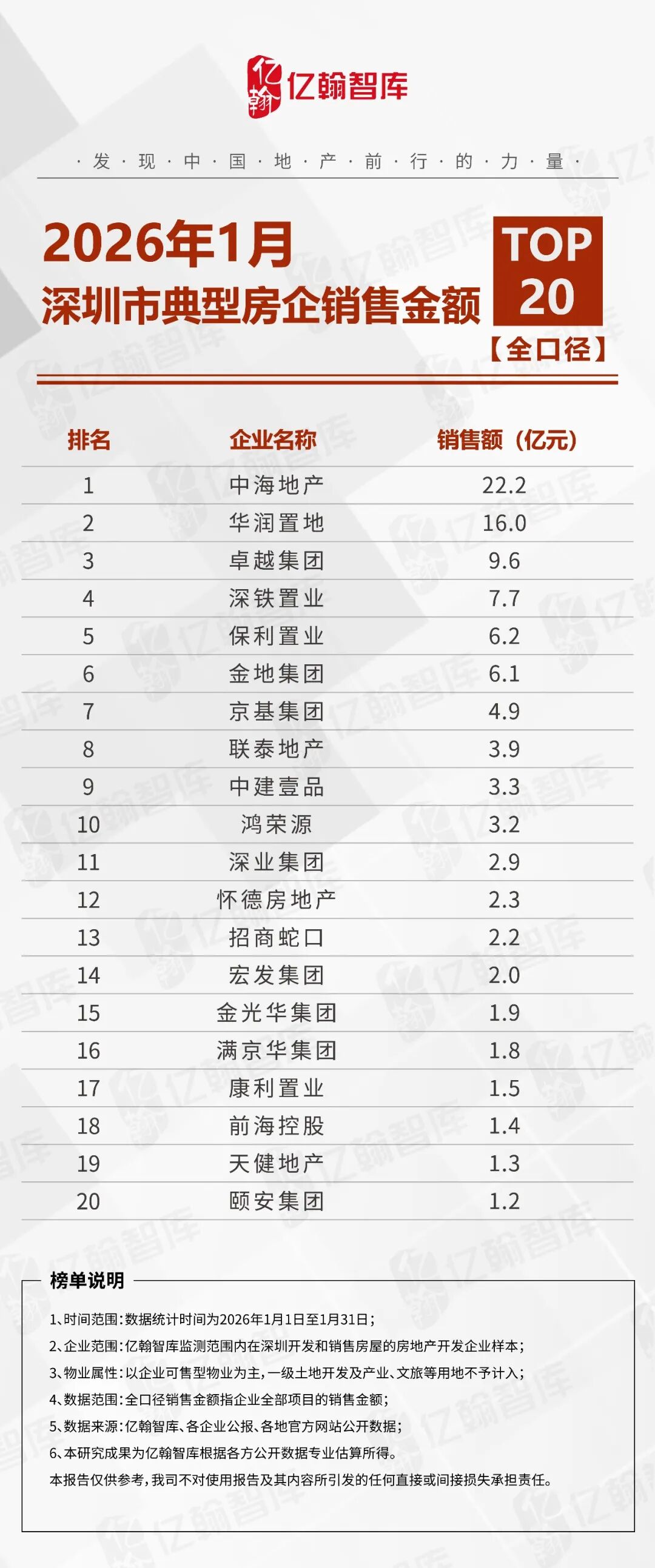 2026年1月,深圳TOP20房企中,中海地产、华润置地、卓越集团分别以22.2亿元、16.0亿元和9.6亿元的销售表现占据榜单前三位。