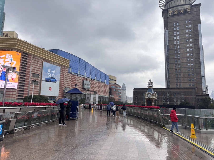 大除夕上昼,陆家嘴地铁站出口天桥,撑着伞的市民旅客。阮佳雯 摄