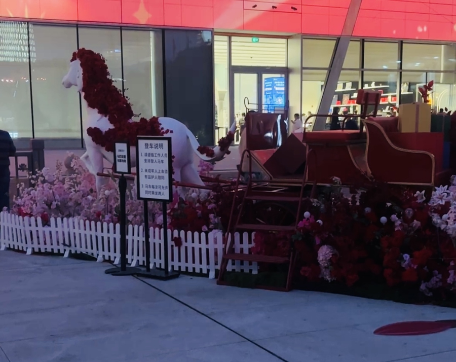 春节前的一个傍晚,记者来到浦东好意思术馆东侧小花圃。中央池塘周围环绕开花束,两侧分立着两匹骏马,马鬃以大红色的鲜花代替。往里走,四面墙上印着不同颜料的马头,辨认写着“赶紧醒目”“赶紧起程”等新春道贺语。