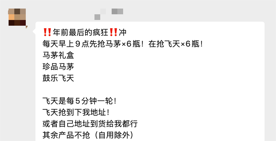 另据中国基金报,一微信群中,一位黄牛直言茅台“缺货”“不够卖”。据悉,目前飞天茅台和马茅仍是较为抢手的品类。